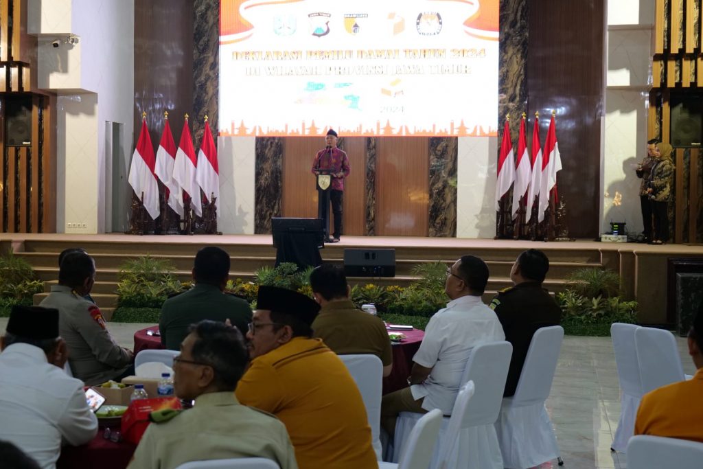 Hal ini ia sampaikan dalam sambutannya di hadapan forum koordinasi pimpinan daerah (Forkopimda), seluruh partai politik, tokoh agama, tokoh masyarakat dan perwakilan BEM se-Jatim