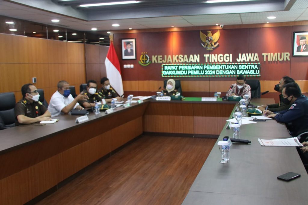 Sebagai persiapan untuk membentuk sentra Penegakan Hukum Terpadu (Gakkumdu) Pemilu 2024 di Provinsi Jawa Timur, Bawaslu Jatim koordinasi dengan Kejaksaan Tinggi (Kejati) dan Kepolisian Daerah (Polda) Jatim, Senin (25/07/2022).
