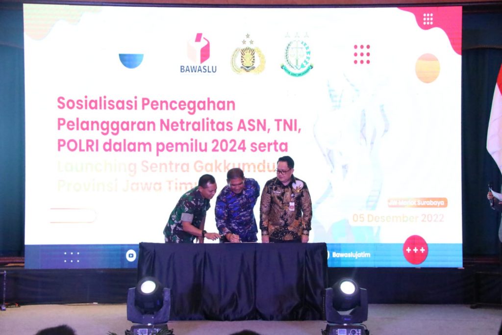 Bawaslu Jatim menyelenggarakan deklarasi netralitas Aparatur Sipil Negara (ASN), Tentara Nasional Indonesia (TNI), dan Kepolisian Republik Indonesia dalam Pemilu 2024, Senin (5/12/2022) di Surabaya.