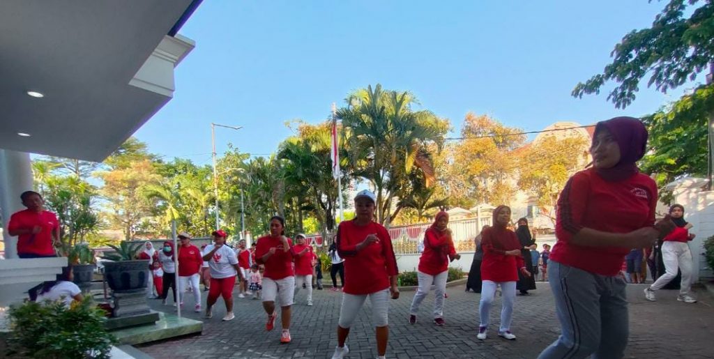 Masih dalam momentum perayaan kemerdekaan Indonesia yang ke-77, Bawaslu Jatim selenggarakan senam sehat bersama masyarakat sekitar kantor, Jumat sore (19/08/2022). Tampak suasana sudah mulai ramai sekitar jam 15.00 dengan pakaian merah putih.