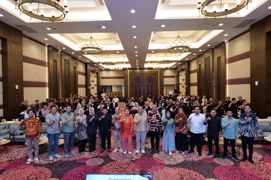 Anggota Bawaslu RI, Totok Hariyono (Tengah, Pakai Baju Krem) bersama Ketua dan Anggota Bawaslu Provinsi Jatim, Fasilitator dan Peserta Pendidikan Pengawas Partisipatif di Sidoarjo, pada 13 Agustus 2025