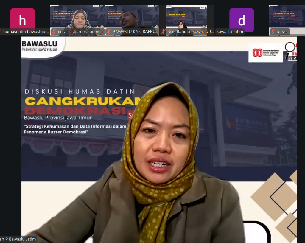 Bawaslu Jatim kembali menggelar Cangkruan Demokrasi secara daring pada Senin, 15 September 2025. Pada seri ke-12 ini tema yang diangkat tentang Strategi Humas dan Data Informasi dalam Menangani Buzzer Demokrasi.