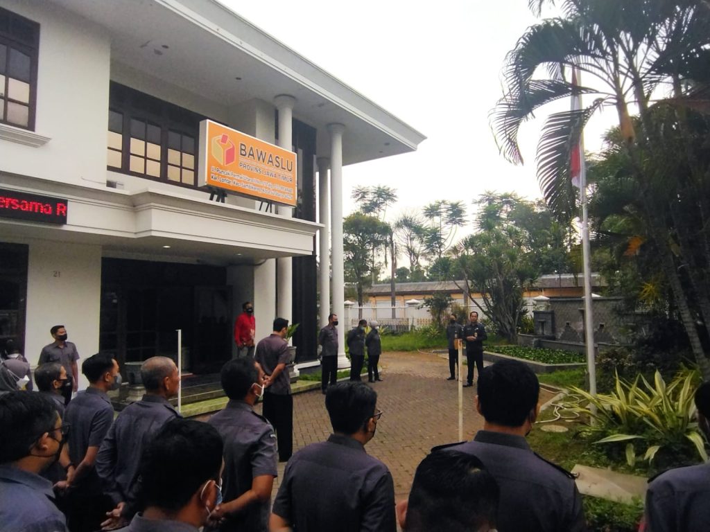 Apel pagi berjalan dengan khidmat. Diikuti oleh pegawai sekretariat. Tampak juga Anggota Bawaslu Jatim, Purnomo Satrio Pringgodigdo turut hadir dalam apel pagi