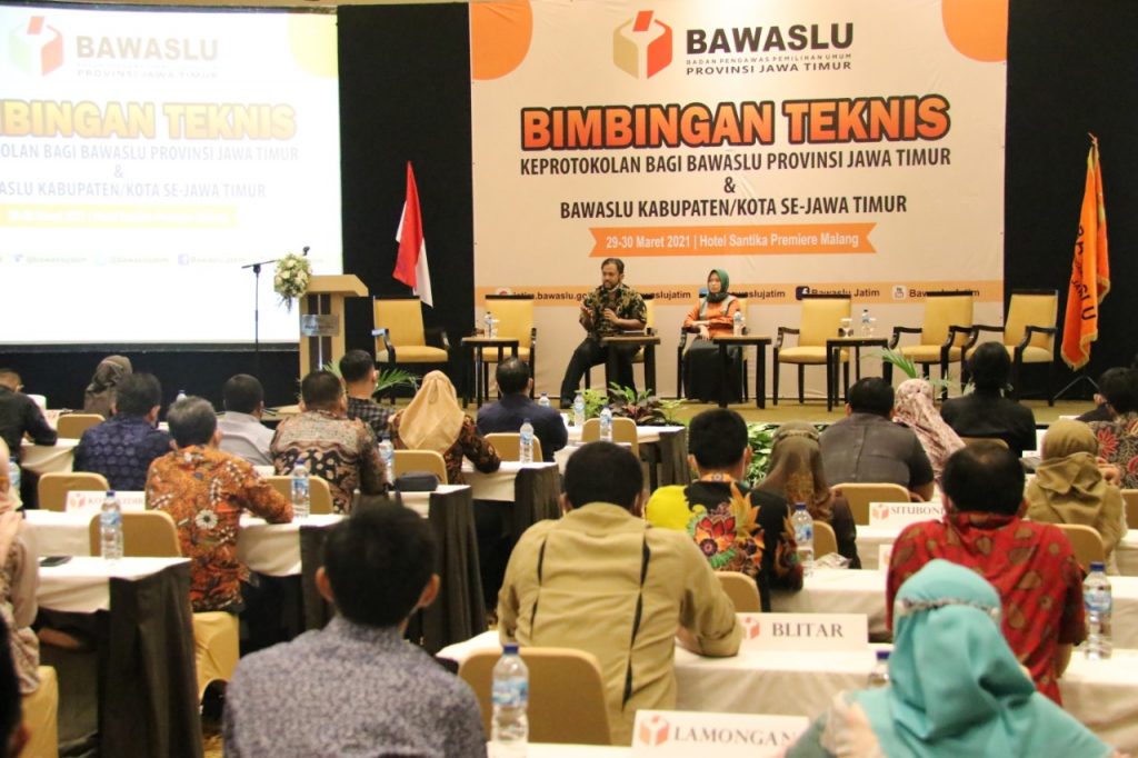 Sebagai informasi tambahan bimbingan teknis keprotokoleran yang diselenggarakan oleh Bawaslu Jatim diikuti oleh pengawas pemilu di 38 Kabupaten/Kota, driver, dan alumni Sekolah Kader Pengawasan Partisipatif (SKPP). Berlangsung sejak 29-30 Maret 2021.